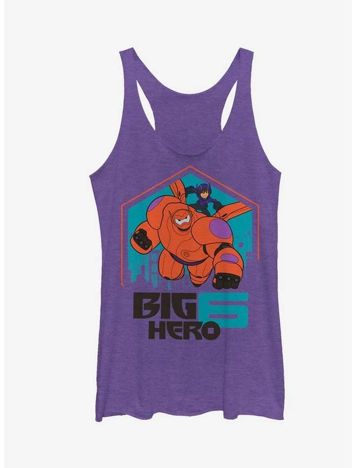 Learn what it means to be a true hero with the Big Hero 6 Baymax and Hiro San Fransokyo Heather Purple Racerback Tank Top! Hiro flies on Baymax’s back above the city of San Fransokyo printed on the front of this cool purple Big Hero 6 tank top. 50% Polyester, 25% Cotton, 25% Rayon. Designed with raw-edge hems.