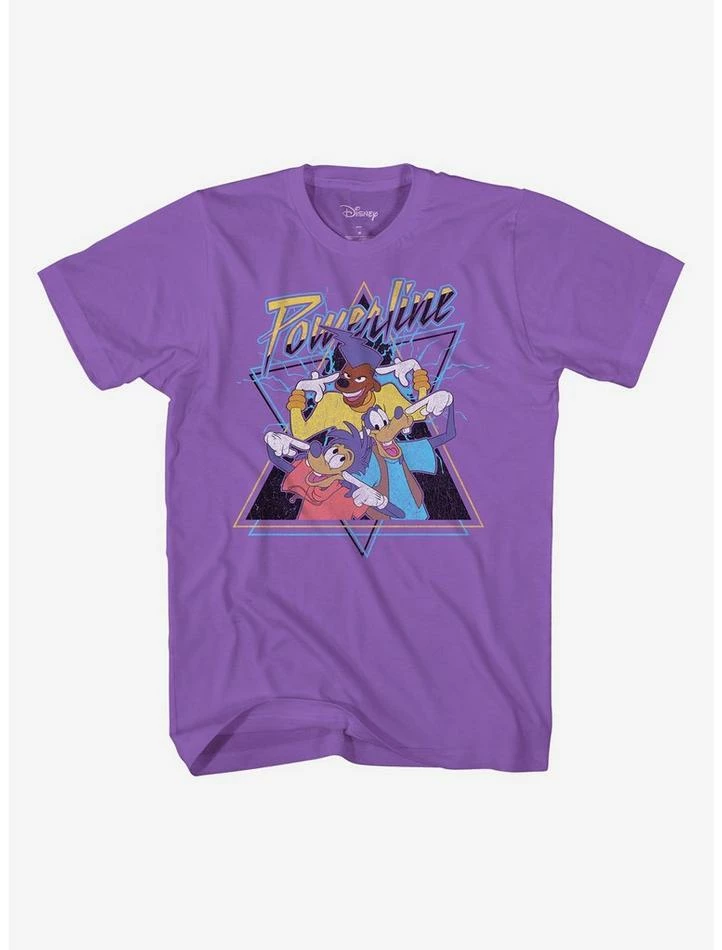 Stand out with Max, Goofy and Powerline on the front of this purple tee! The trio from A Goofy MovieΒ are printed with a triangle background and “Powerline” above.Β