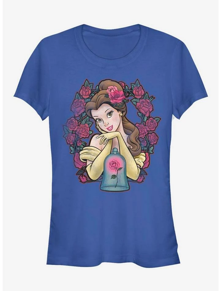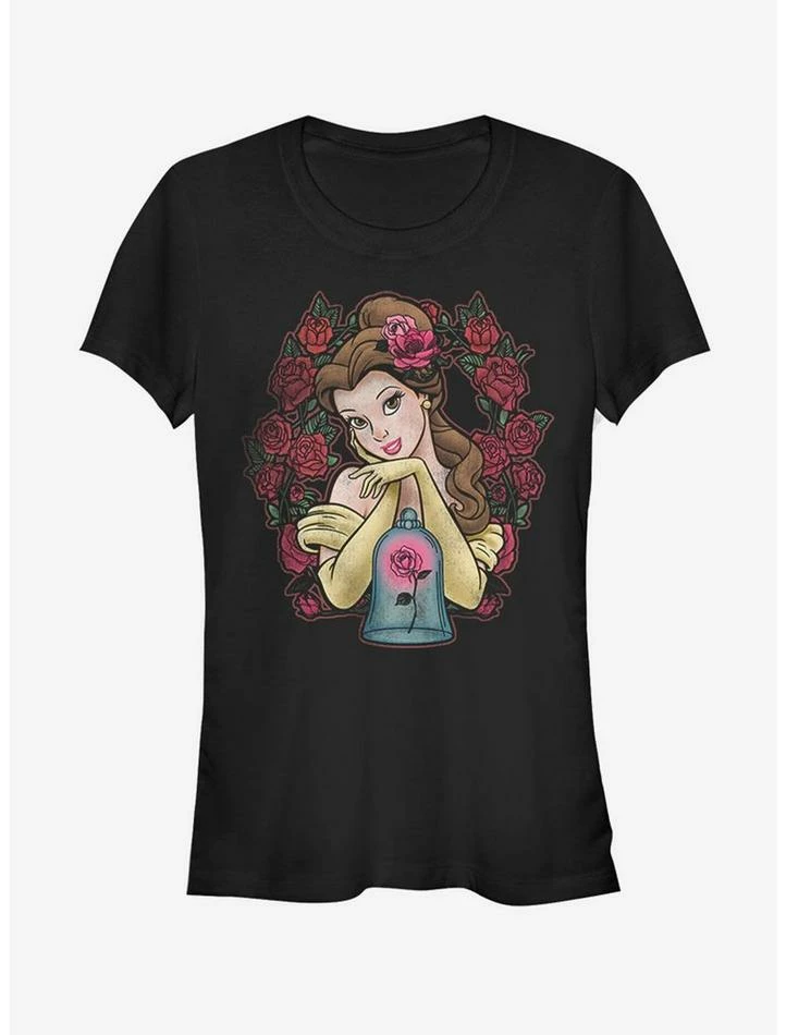 Belle, from Disney’s Beauty and the Beast, graces the front of this fitted black tee in a design that’s all about roses. It’s simply enchanting!