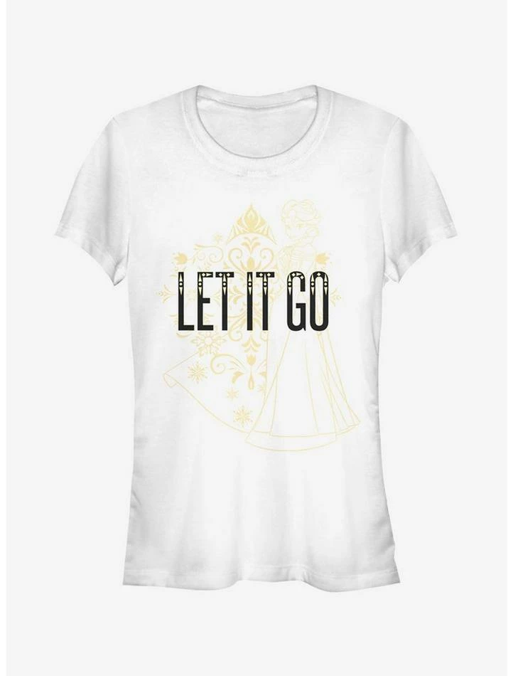 Channel your inner Elsa and let your worries float away with the Disney Frozen Elsa Let It Go Juniors’ T-Shirt! A ornate pattern features Queen Elsa with her famous personal motto “Let It Go” in yellow and black text down the front of this cute Frozen tee.