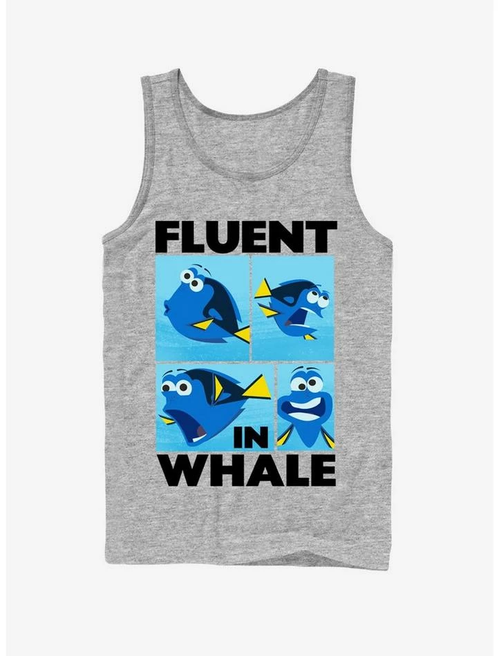 Show off your knowledge of other languages with the Finding Dory Fluent in Whale Heather Gray Tank Top! Big black letters spell out “Fluent in Whale” next to four images of Dory speaking whale printed on the front of this funny Finding Dory shirt. 50% Cotton, 50% Polyester.