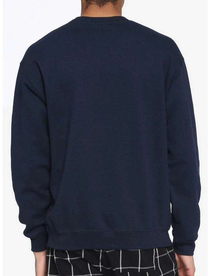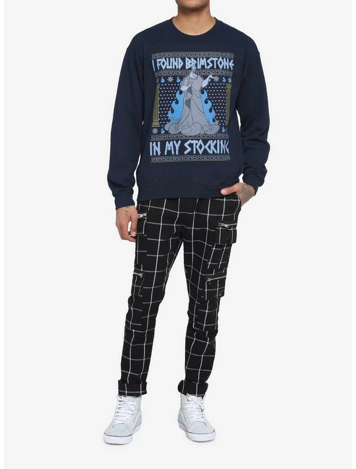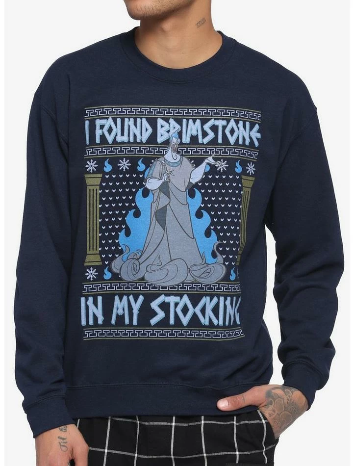 Get in the holiday spirit with the Lord of the Dead! This navy sweatshirt features an image of Hades on a Fair Isle background and “I found brimstone in my stocking.”