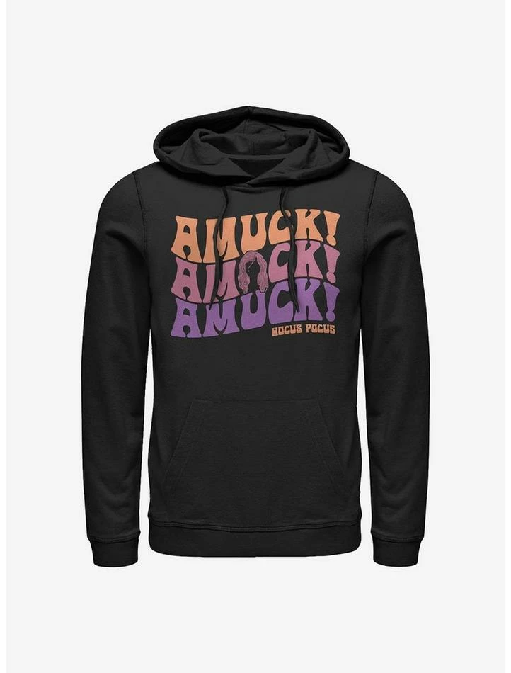 The perfect shirt to run amuck! amuck! amuck! in. This black pullover hoodie — inspired by Hocus Pocus — features the excitable quote from Sarah Sanderson.