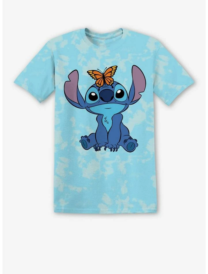 We’re all aflutter for this tee that’s from out of this world! From Planet Turo, this Lilo & StitchΒ tee features a light blue tie-dye design, with Stitch sitting front and center, and a butterfly resting on his head.
