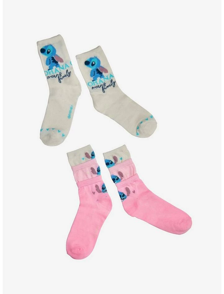 Get ready for a weekend getaway with your ohana by packing these crew socks! Your favorite extraterrestrial is ready to tag along on your adventures with this set of Lilo & Stitch crew socks. Features “Ohana means family” on one with Stitch on the outer facing side, and another pair with a layered design with Stitch peeking out over each layer on the back side.
