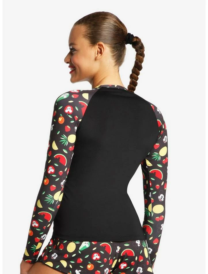 After a fun day catching some waves, treat yourself to a yummy picnic on the beach! This long-sleeved rash guard has a raglan design with a toss print of fruit with Mickey Mouse heads, and an image of a watermelon slice on the chest and Mickey Mouse’s face. Pair with the matching boardshorts to complete your look!