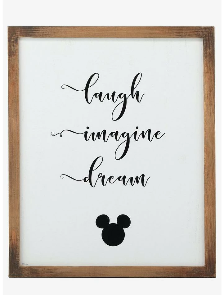 Laugh, imagine, and dream and you will always be able to find happiness. Hang this wood framed Mickey Mouse wall decor and add just a little more happiness to your home.