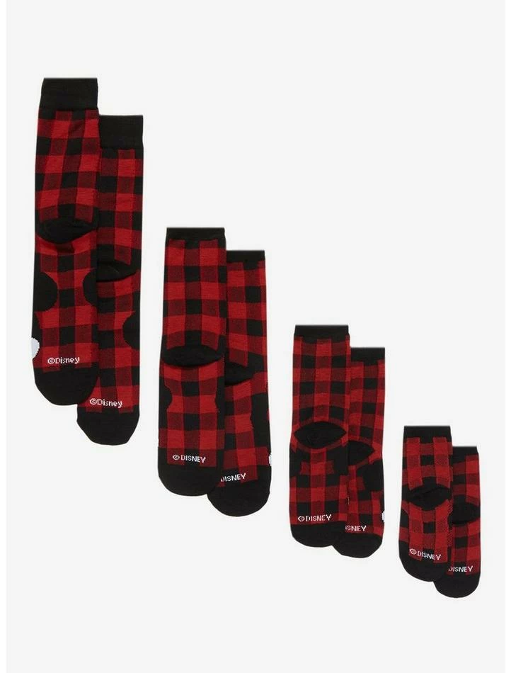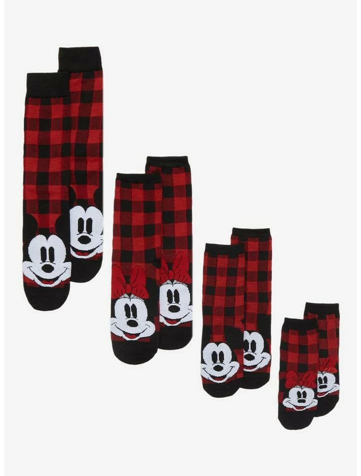 Get ready for the annual family pajama holiday photo with some matching socks! This family set includes red plaid socks featuring Mickey Mouse and Minnie Mouse designs.