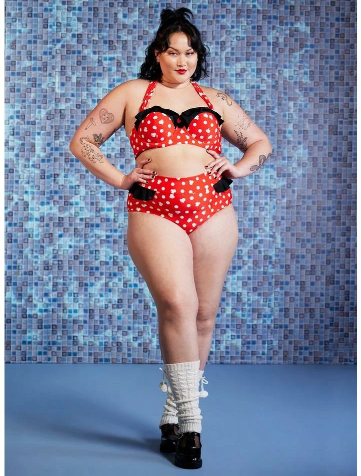 Rock the dots poolside with these Minnie Mouse inspired swim bottoms! Featuring her iconic red and white polka dot print, with some dots shaped as her head, and black ruffles at the hip. Pair with the matching top to complete your poolside look!