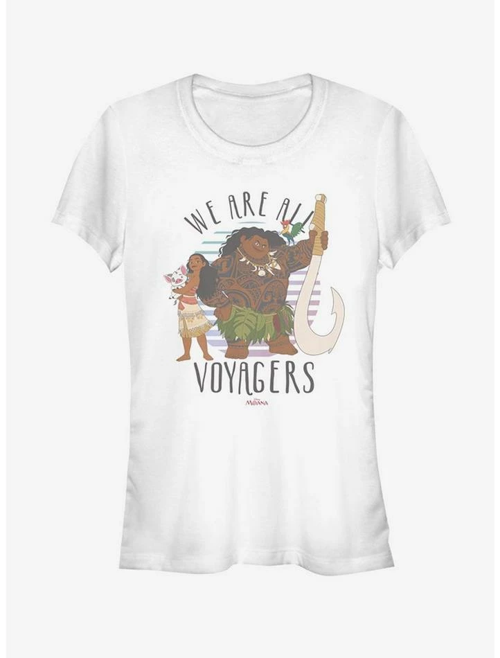 Discover your inner voyager with the help of this fitted white tee from Disney’s Moana. It features Moana holding Pua and Heihei perched on Maui, surrounded by “We are all voyagers” verbiage.
