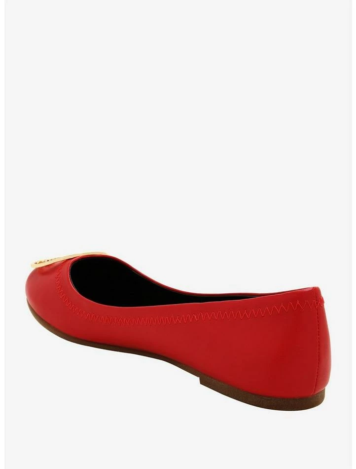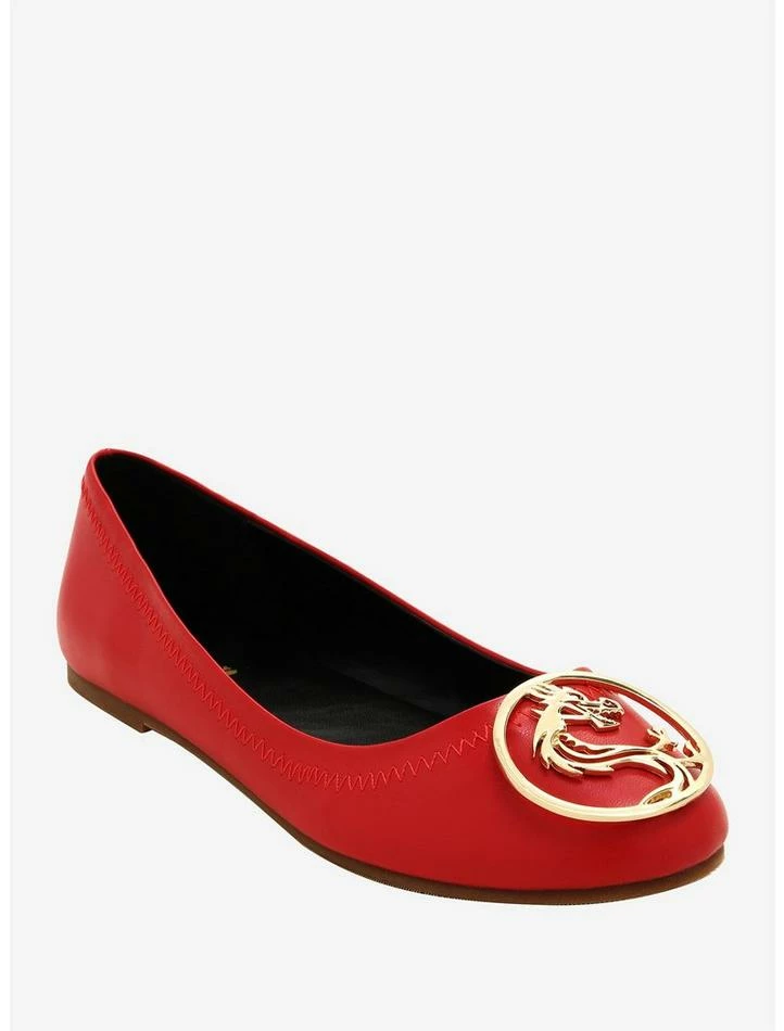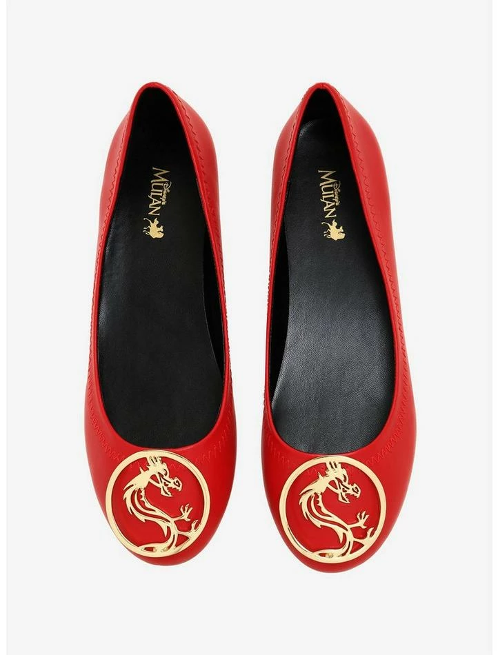 Please bring honor to… your wardrobe! These red faux leather flats will be sure to make a bold statement in your outfit. From Disney’s Mulan, they have a gold metal emblem of Mushu on the toes.