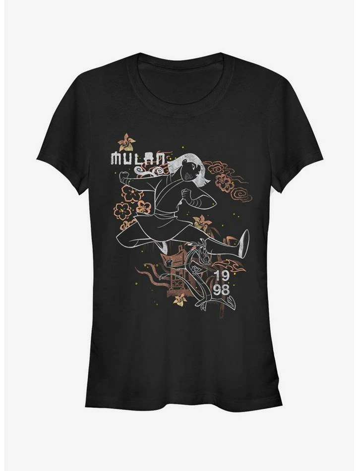 This fitted black tee features beautiful imagery inspired by Disney’s Mulan – with an outline of Mulan in battle, and 1998 – the year the film came out.