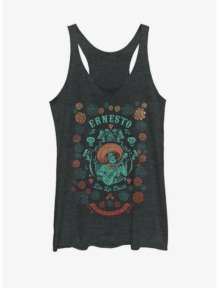 Ernesto may not be the best hero for Miguel, but he’s still a pretty snazzy dresser with the Pixar Disney Coco Ernesto de La Cruz Women’s Racerback Tank Top. Miguel’s idol-turned-villain, Ernesto, is printed with his name and hit song “Remember Me” across the front of this Coco tank top.