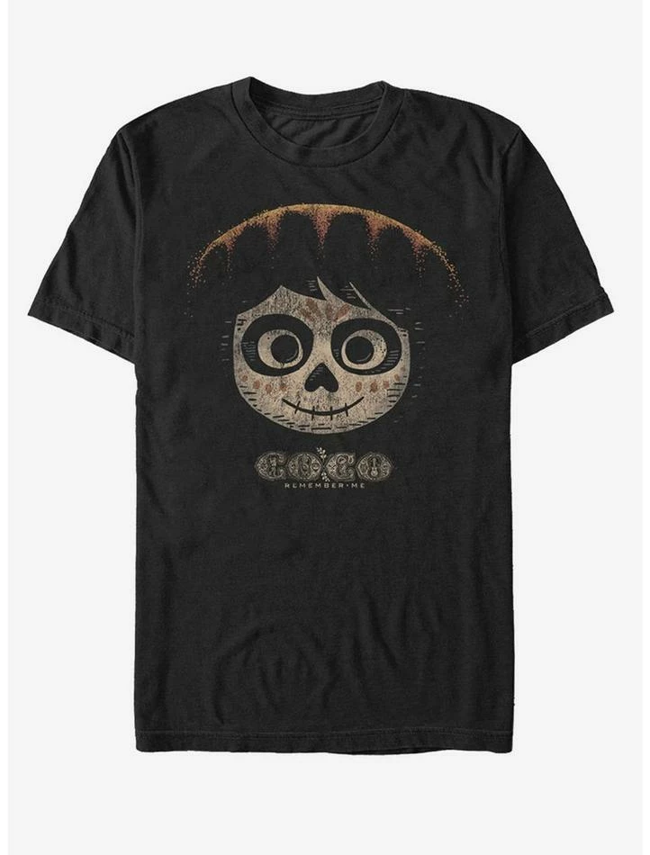 Help Miguel pass undetected through the Land of the Dead by wearing the Pixar Disney Coco Miguel Skeleton Hat Men’s T-Shirt. The young Miguel is pictured in his skeleton makeup and hat on this cool Coco shirt.