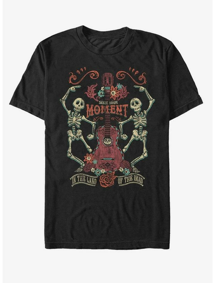 Help Miguel follow his dreams and find the Pixar Disney Coco Seize Moment Skeleton Dance Men’s T-Shirt. Two distressed skeletons dance alongside “Seize the Moment” and “In the Land of the Dead” on this cool Coco shirt.