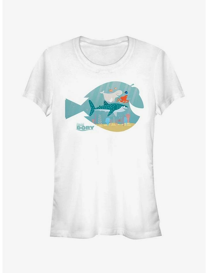 Dory wants to meet her family dressed in her best with the Finding Dory Fish Frame Juniors’ T-Shirt! The whole gang is here and Destiny, Hank, Nemo, Marlin, Bailey, and Dory are portrayed within a fish frame on this awesome Finding Nemo shirt!
