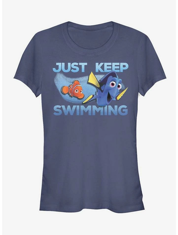 It’s time to grab the Finding Dory Just Keep Swimming Current Juniors’ T-Shirt and help Dory find her family! Nemo, and Dory swim across this adorable fitted Finding Dory tee that reads “Just Keep Swimming” down the front.