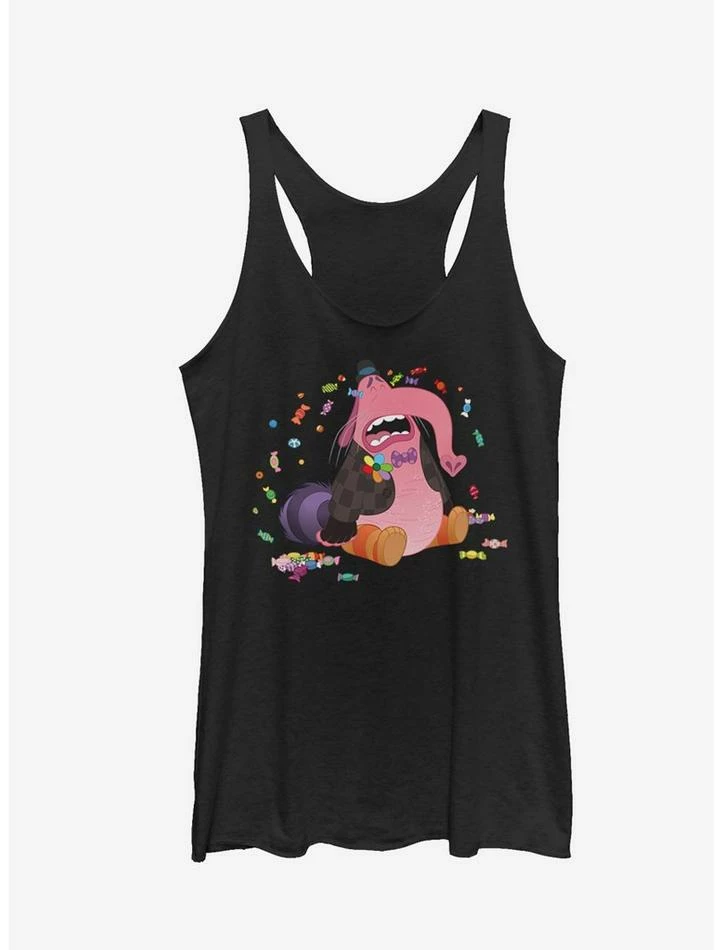 Who’s your friend who likes to play? The Inside Out Bing Bong Cry Candy Heather Black Racerback Tank Top! Riley’s imaginary friend Bing Bong cries candy tears in a slightly distressed print on the front of this awesome black Inside Out shirt. 50% Polyester, 25% Cotton, 25% Rayon. Designed with raw-edge hems.