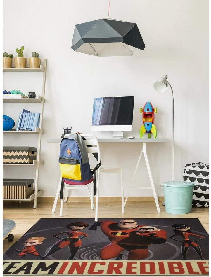 Whether you’re living the quiet suburban life, or saving the world, this Incredibles 2 jumbo area rug will remind you that everyone’s a super hero in their own way. Digitally printed, measures 4’6″ x 6″6.