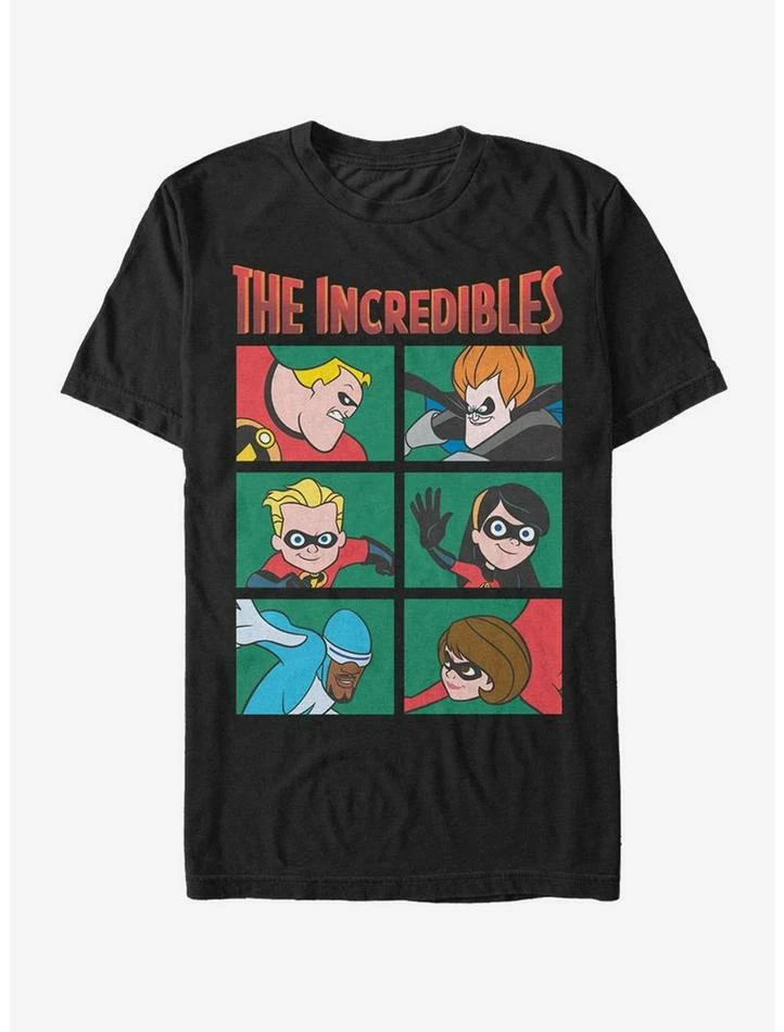 Calling all superheroes! Grab this tee and get ready to fight some super villains! This fun black Incredibles shirt portrays some of your favorite characters like Mr. Incredible, Elastigirl, Violet, Dash, and Frozone down the front.