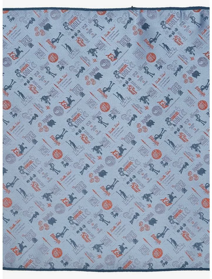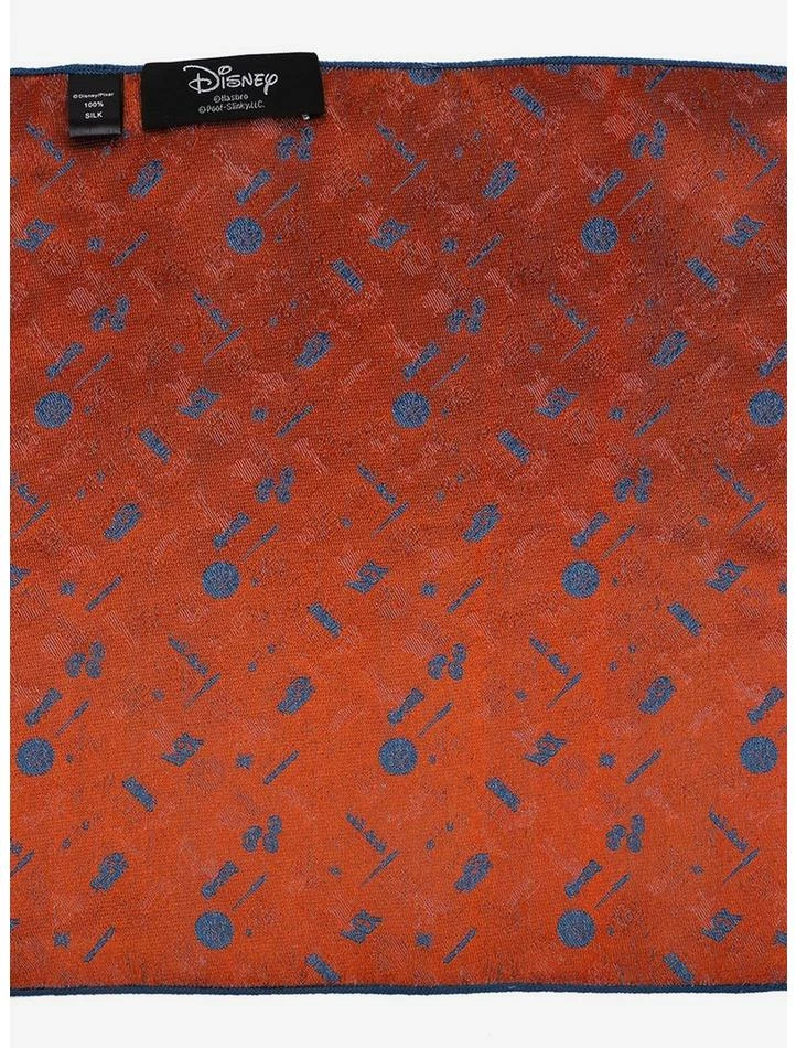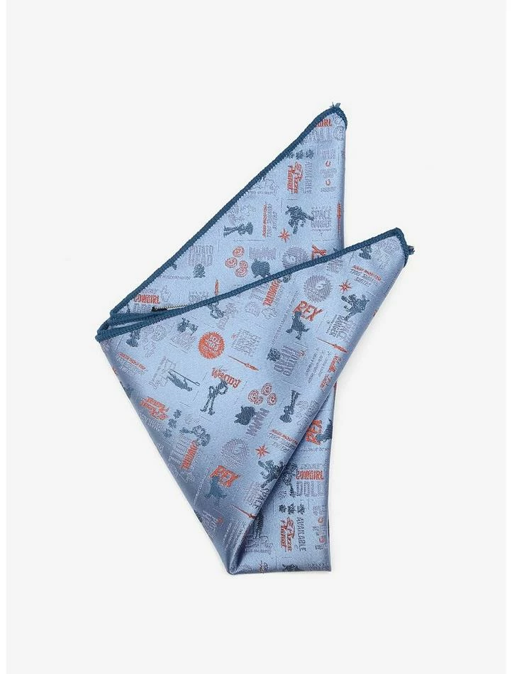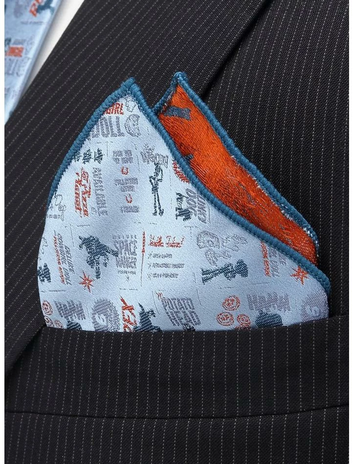 Soft baby blue forms the backdrop to this 100% silk pocket square. All your favorite characters from Toy Story 4 make an appearance here, including Woody, Buzz, Jessie, Bo Peep, and even Hamm. How many more can you spot? Officially licensed by Disney/Pixar.