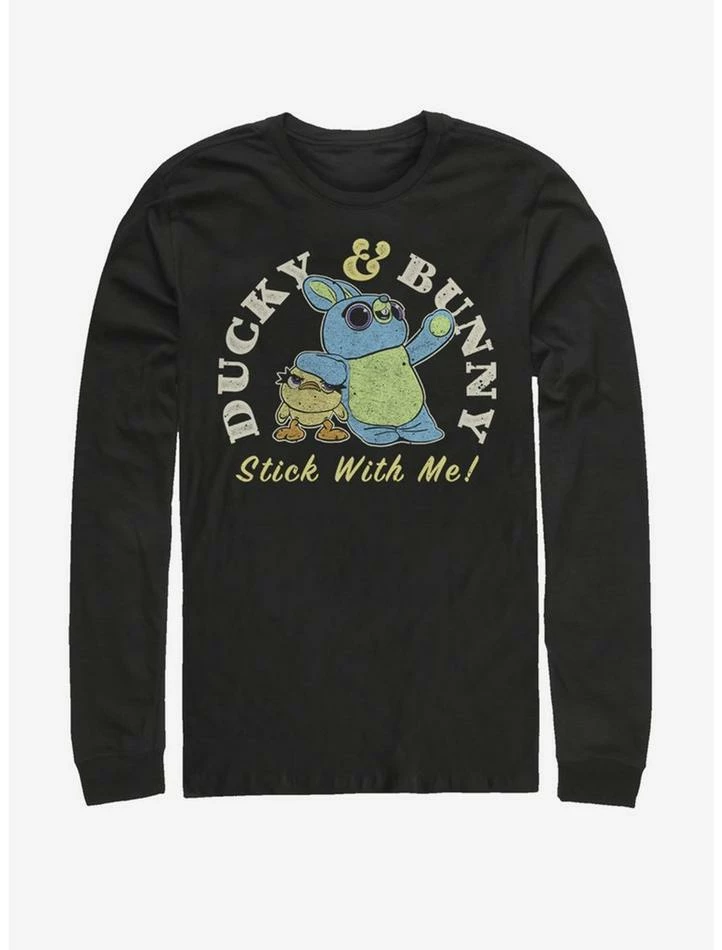 Ducky and Bunny. Remember their names, ’cause they’re pretty much going to be your new favorite Toy Story characters! This black long-sleeve tee features the comedic carnival toys – with Bunny proclaiming, “Stick with me!”Β