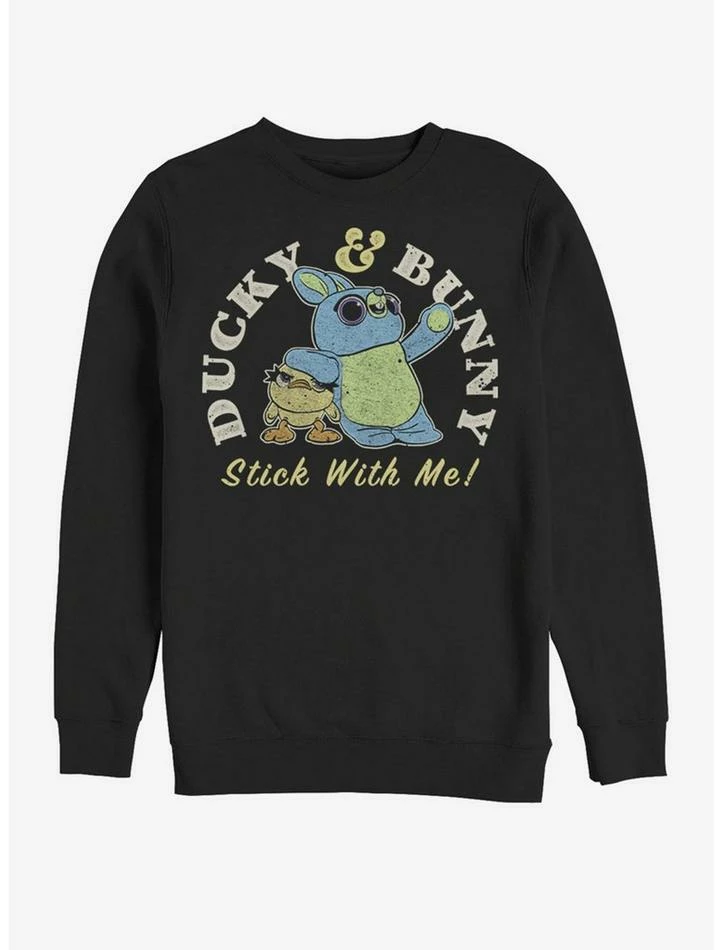 Ducky and Bunny. Remember their names, ’cause they’re pretty much going to be your new favorite Toy Story characters! This black sweatshirt features the comedic carnival toys – with Bunny proclaiming, “Stick with me!”