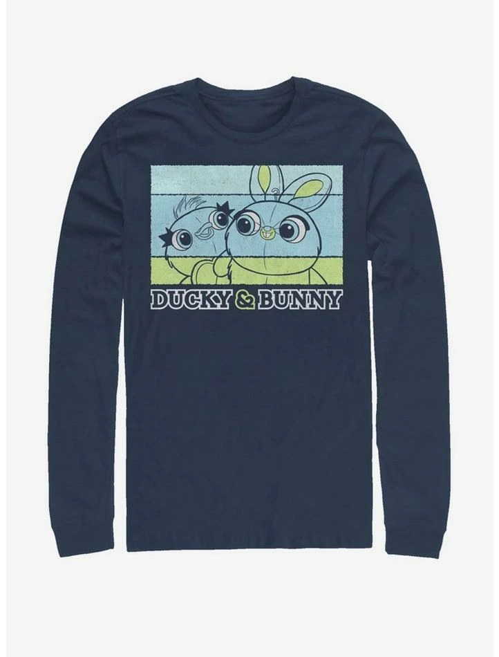 Ducky & Bunny, the sassiest toys of all, appear on the front of this navy blue long-sleeve tee inspired by Toy Story 4.