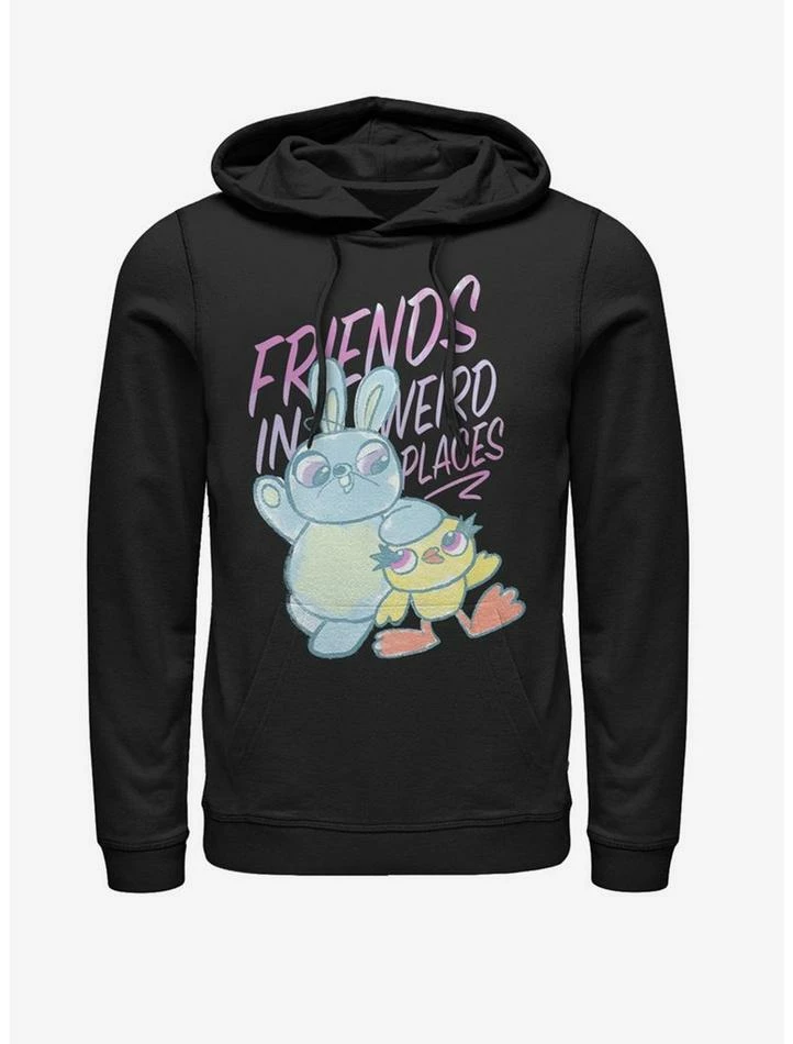 Stay weird! Bunny and Ducky from Toy Story 4 appear on the front of this pullover black hoodie that says, “Friends in weird places.”