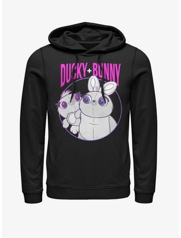 Raise the horns for Toy Story 4. Best buds – and new toys – Ducky and Bunny appear on the front of this black pullover hoodie.