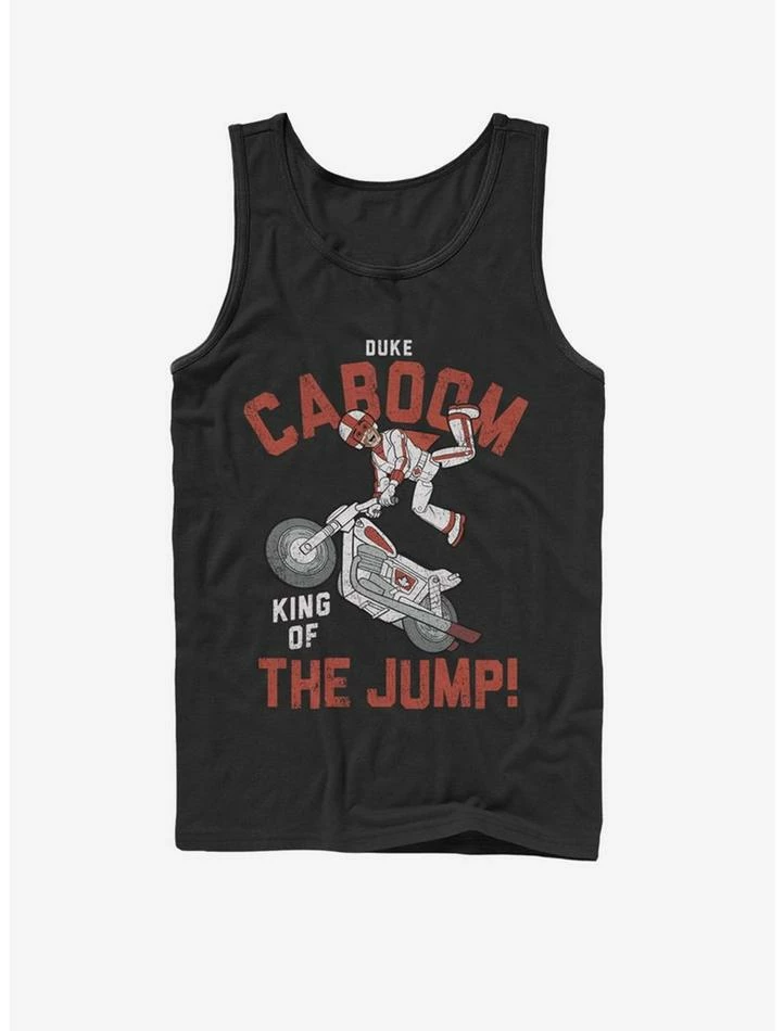 We believe in you, Duke Caboom! Show your support for the King of the Jump with this black tank inspired by the daredevil stuntman toy from Toy Story 4.