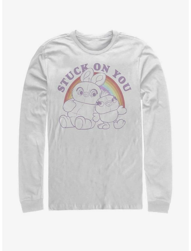 Bunny and Ducky are stuck on each other. Wear this shirt and they’ll be stuck on you, too! This white long-sleeve tee features the carnival pals from Toy Story 4 in front of a rainbow.