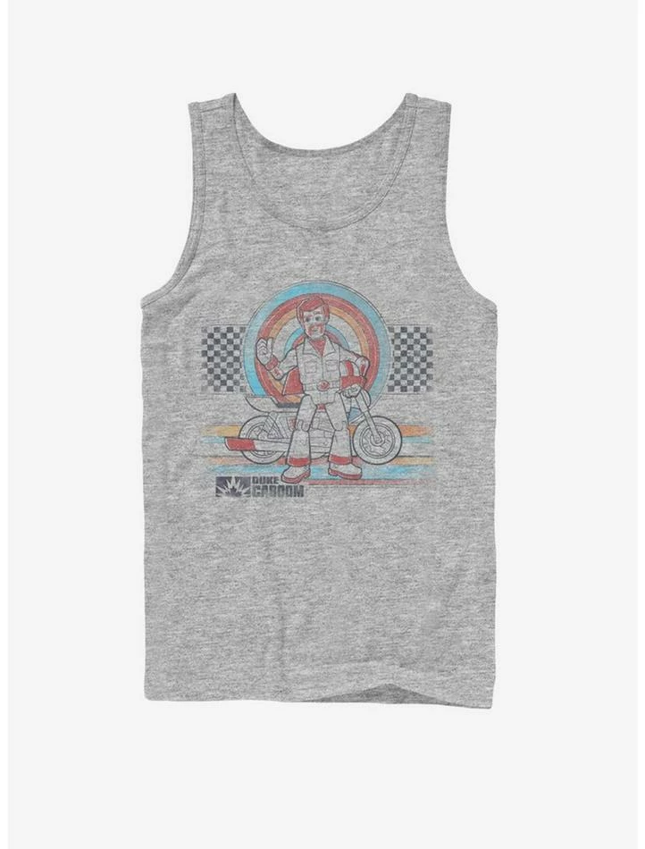 A vintage style tank top for everybody’s favorite Canadian stuntman toy! This heathered tank has a front screen featuring Duke Caboom from Toy Story 4.
