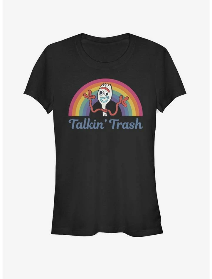 Is Forky a toy – or is he trash? Think about that while you wear this fitted black tee featuring the Toy Story 4 character in front of a rainbow.