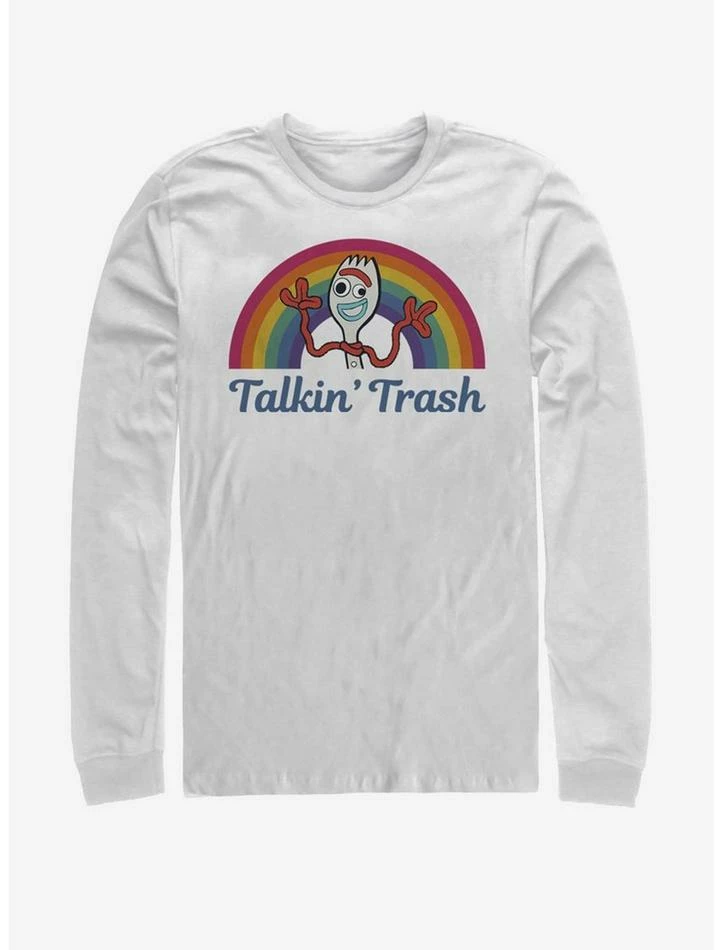 Is Forky a toy – or is he trash? Think about that while you wear this white long-sleeve tee featuring the Toy Story 4 character in front of a rainbow.