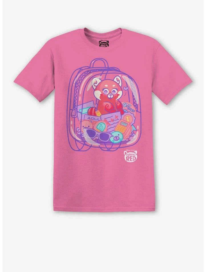 Are you ready for Turning Red? We heard it’s gonna be the beast! This pink ombrΓ© tee features a graphic of a clear backpack with sunglasses, a phone and other miscellaneous teenager-girl possessions. There’s even a red panda in it!