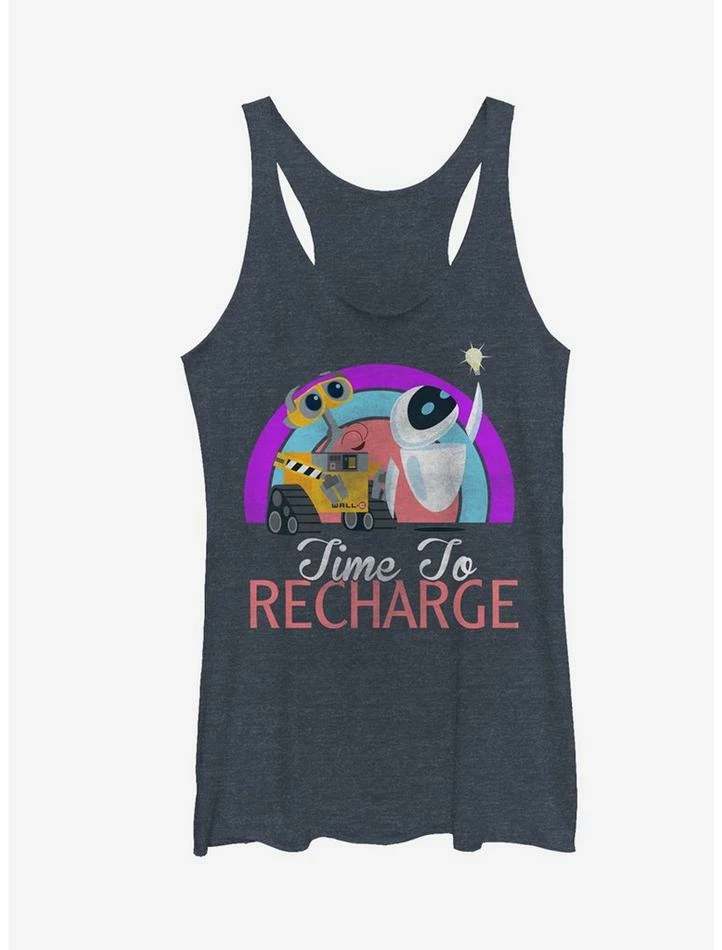 When your day’s work is done, relax and recharge with the WALL-E Time to Recharge Heather Navy Blue Racerback Tank Top! A lightly distressed print on the front of this cute WALL-E shirt features the phrase “Time to Recharge” next to robot pals EVE and WALL-E. 50% Polyester, 25% Cotton, 25% Rayon.ย Designed with raw-edge hems.