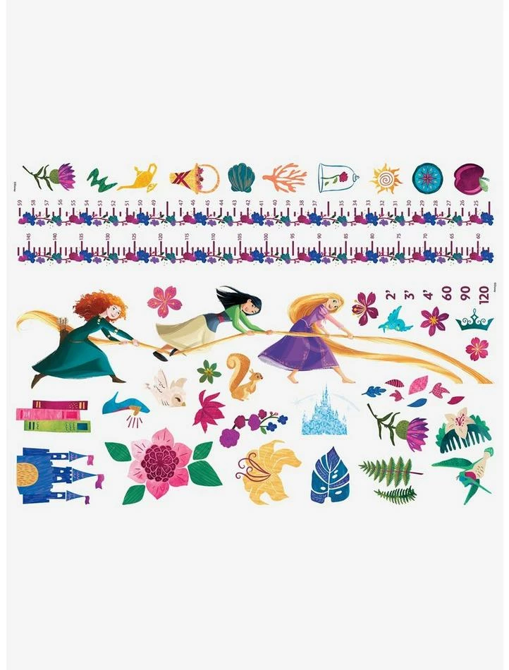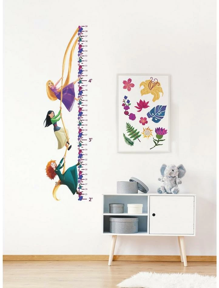 Watching your little one grow up is a magical experience, so why not make enchanting memories with this 5-feet-tall, officially-licensed, Disney Princesses Growth Chart Peel and Stick Wall Decal!? Merida (from Brave) and Mulan join Rapunzel (from Tangled) and her iconic locks up the floral chart, watching over as your princess grows! If your walls could tell a story, make it a fairytale just peel, stick & done!
