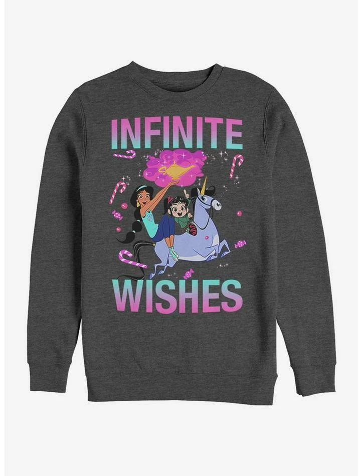 This grey sweatshirt from Disney’s Ralph Breaks the Internet features Princess Jasmine and Vanellope on a magical unicorn. We see Jasmine holding the Genie’s lamp… infinite wishes, perhaps?
