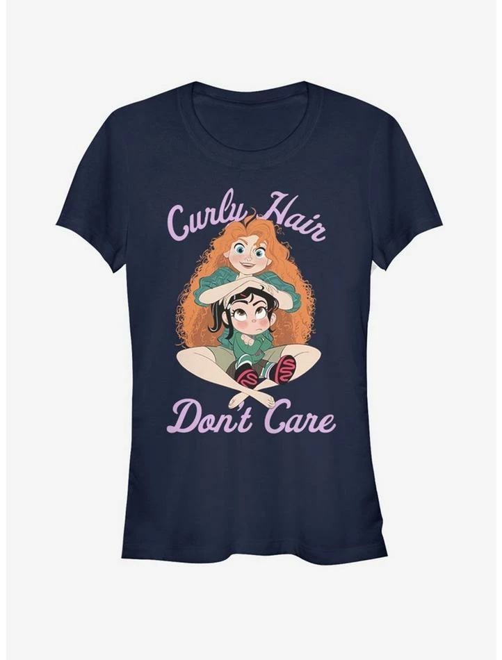 This navy tee from Disney’s Ralph Breaks the Internet features Merida hanging out with Vanellope with “Curly hair don’t care” text design.