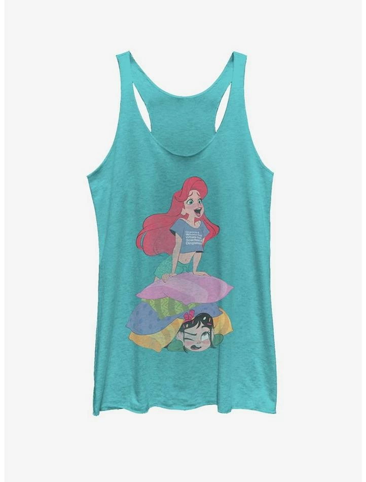 What would a sleepover with the princesses be like without Ariel breaking out into song? This teal tank from Disney’s Ralph Breaks the Internet features Ariel singing on top of a stack of pillows with Vanellope trying to block out the noise.