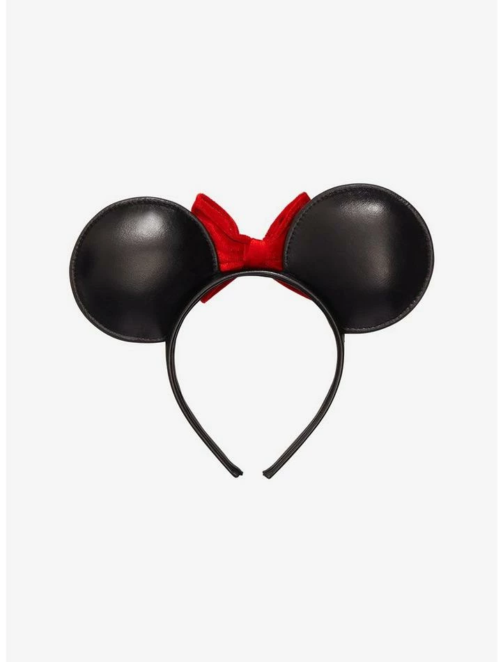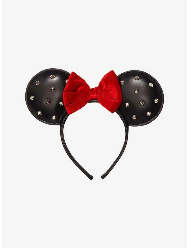 Minnie Mouse is trading in her dots for something more edgy! This Minnie Mouse ear headband features silver-tone spike accents, plus a red velvet bow in the center.