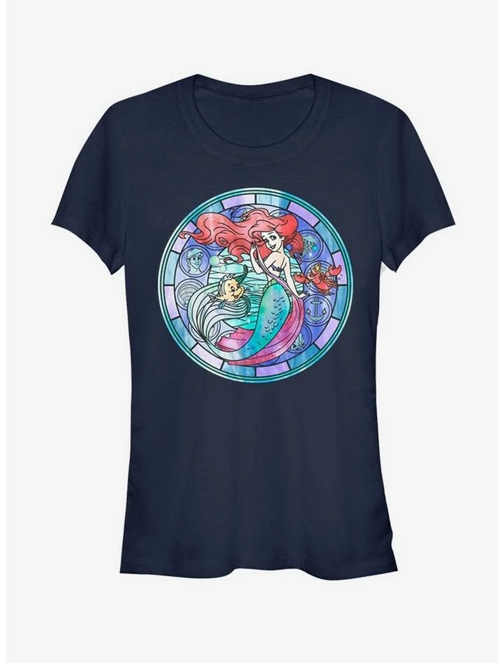 This tee is mer-mazing! A fitted blue shirt featuring Ariel, Flounder, Sebastian and other The Little Mermaid-inspired iconography immortalized in a stained glass-inspired design.