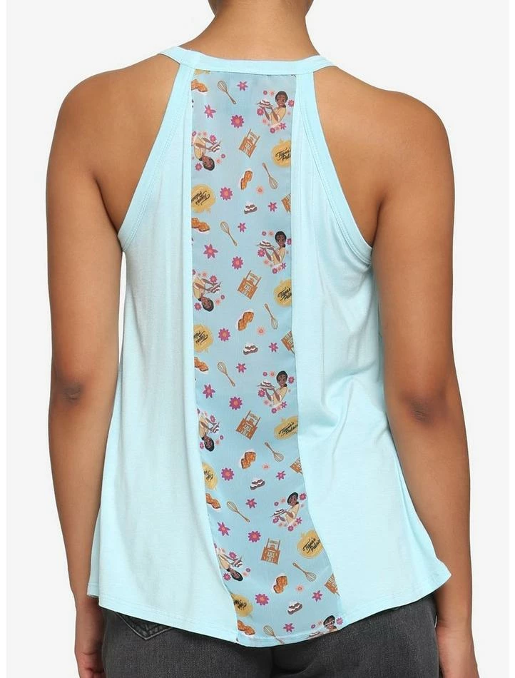 The best place for some fresh beignets? Tiana’s Palace, of course! Dress appropriately for your trip to the best restaurant in New Orleans with this cami. From The Princess and the Frog, this cami features a high neck silhouette and a print of Tiana holding a plate of the pastries, with “Tiana’s Palace” up top and “The best food in New Orleans!” printed underneath. The backside also features a sheer panel down the center with an allover toss of Tiana and other icons relating to her restaurant.