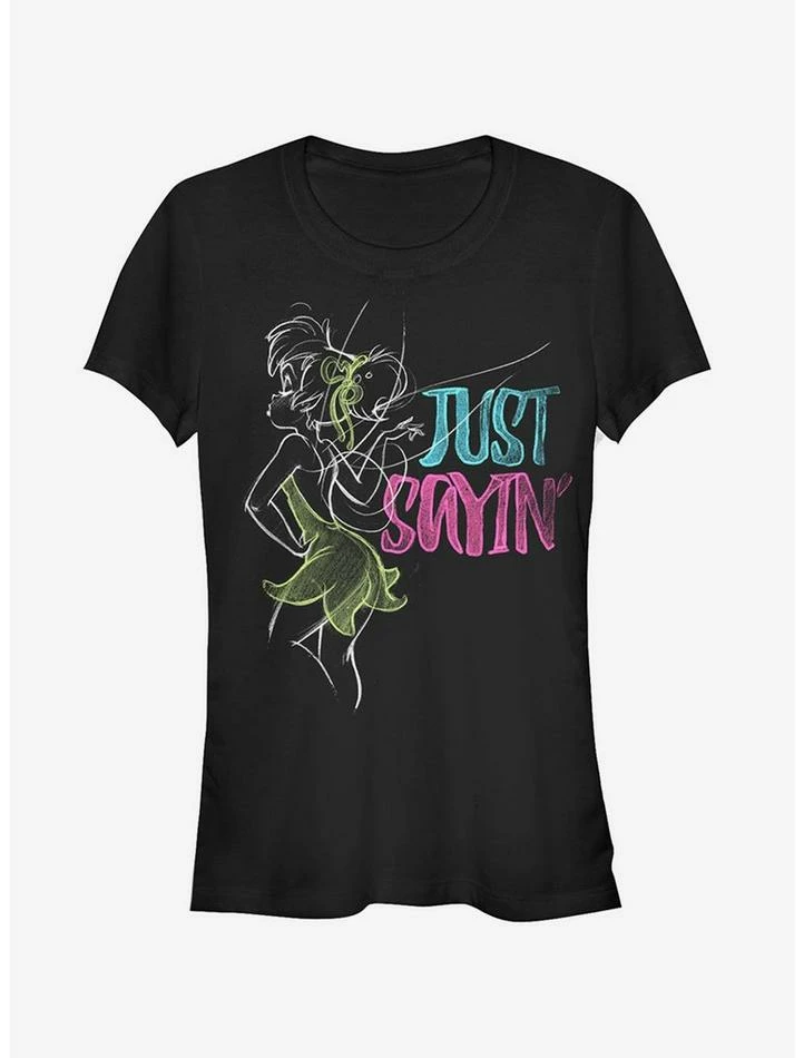 She may not say a whole lot but you can still tell she’s got attitude on the Disney Tinker Bell Just Saying T-Shirt! This funny fitted Tink tee reads “Just Sayin'” in a fun chalk-style font next to your favorite Pixie.