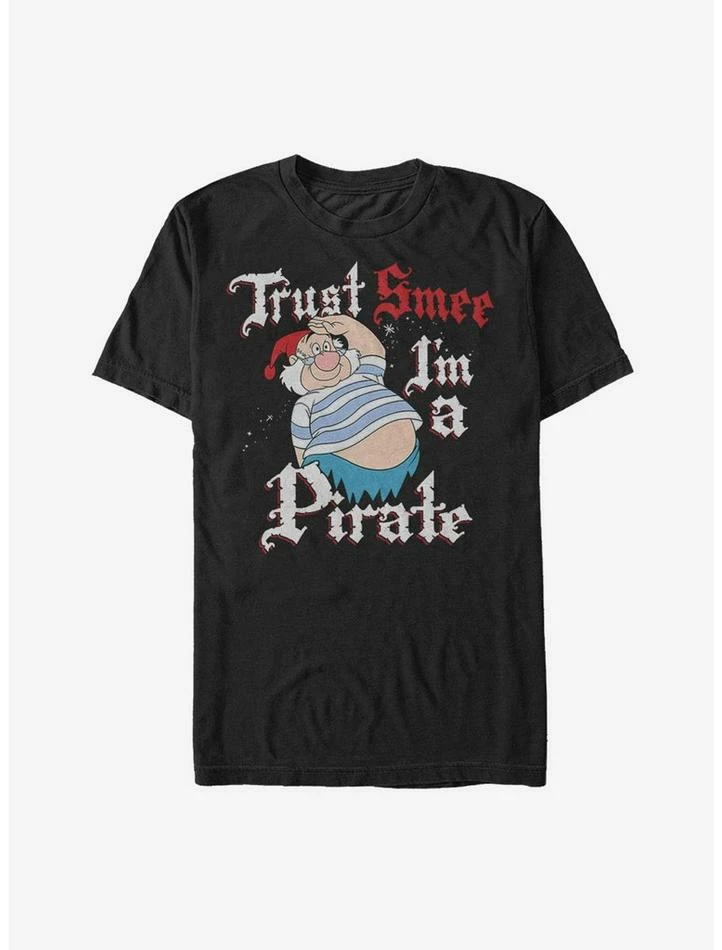He may be a scallywag and a pirate but he’s definitely the cutest one around in the Disney Peter Pan Trust Smee Black T-Shirt! Your favorite sidekick, Smee, stands at attention with “Trust Smee I’m a Pirate” in red and white print across this funny Peter Pan shirt. 100% Cotton.