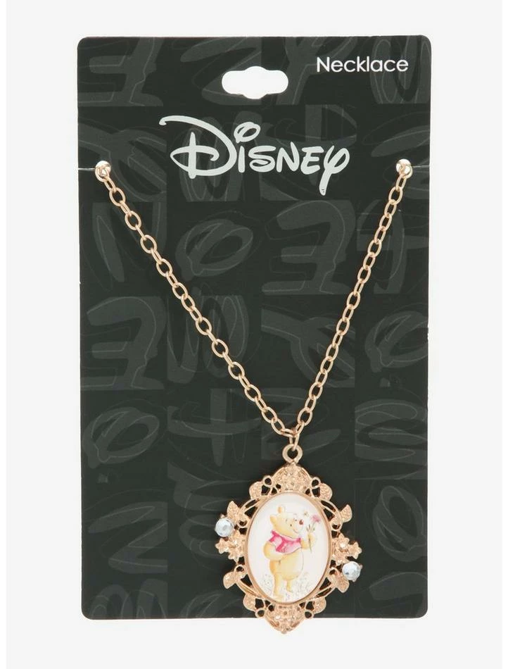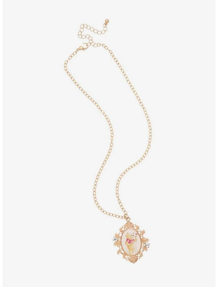Take a bit of the Hundred Acre Wood wherever you go in this elegant cameo necklace! This gold-tone piece from Winnie the Poohย features a watercolor-inspired portrait of your favorite silly old bear in an ornate frame full of filigree and faux gems.