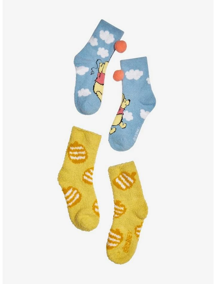Stay cozy with the help of your Hundred Acre Wood fave! These Winnie the Pooh fuzzy socks feature one pair depicting Pooh flying through the clouds with pom detailing as the balloon. The other pair highlights a toss print of honey jars.
