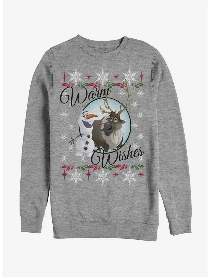 Never let it go, never let the Disney Frozen Christmas Warm Wishes Heather Gray Oversized Sweatshirt gooooo! Sven and Olaf smile out at you from this cute boyfriend-cut gray Christmas sweatshirt that reads “Warm Wishes” alongside snowflakes and holly! 50% Cotton, 50% Polyester.