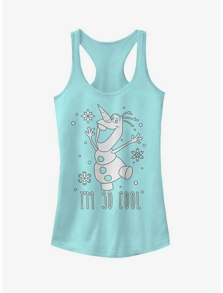 Elsa gifted Olaf his own personal winter as well as the Disney Frozen Olaf So Cool Light Blue Racerback Tank Top! Olaf dances inside his own little snowstorm with “I’m So Cool” beneath him on this cute fitted blue tank top. 60% Cotton, 40% Polyester.